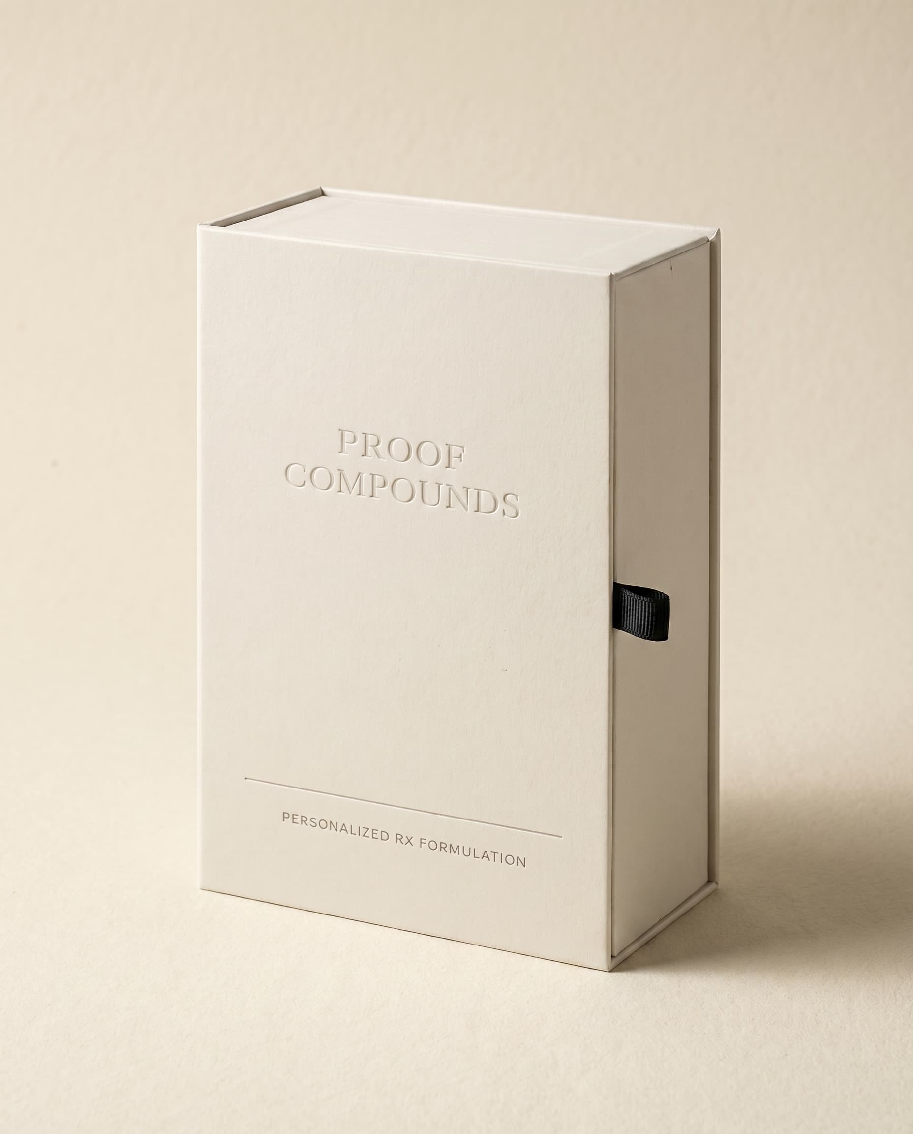 Every touchpoint — the cream matte box, the debossed wordmark, the black ribbon pull, the fitted foam, the physician card — is intentional. Nothing is decorative; each detail reinforces the structure of the pathway.